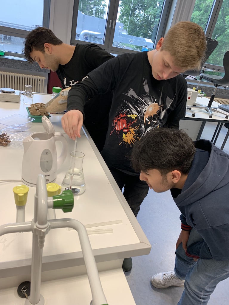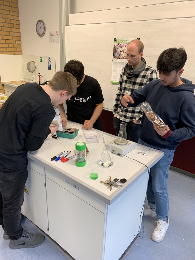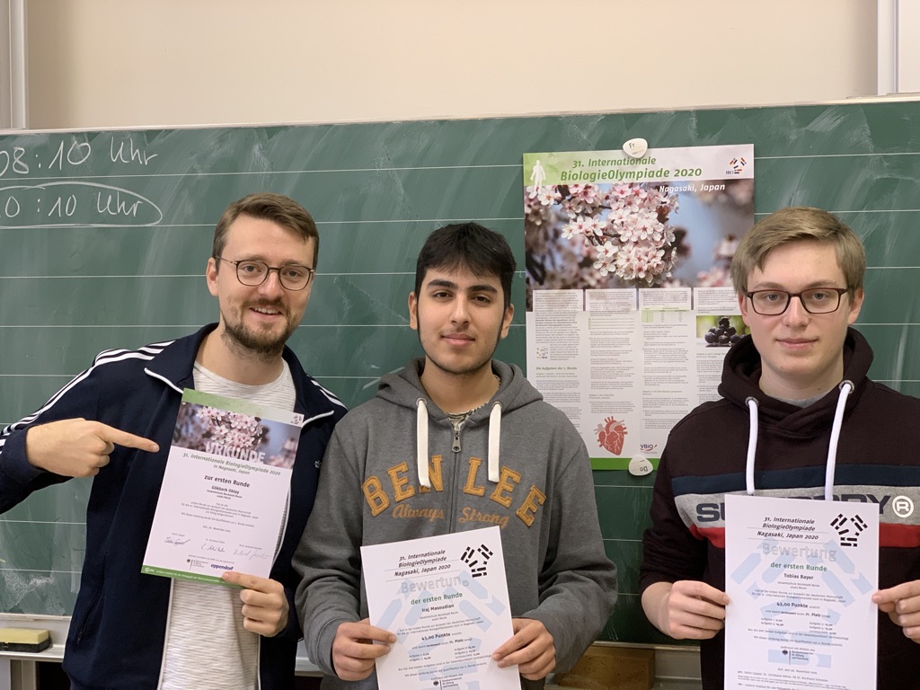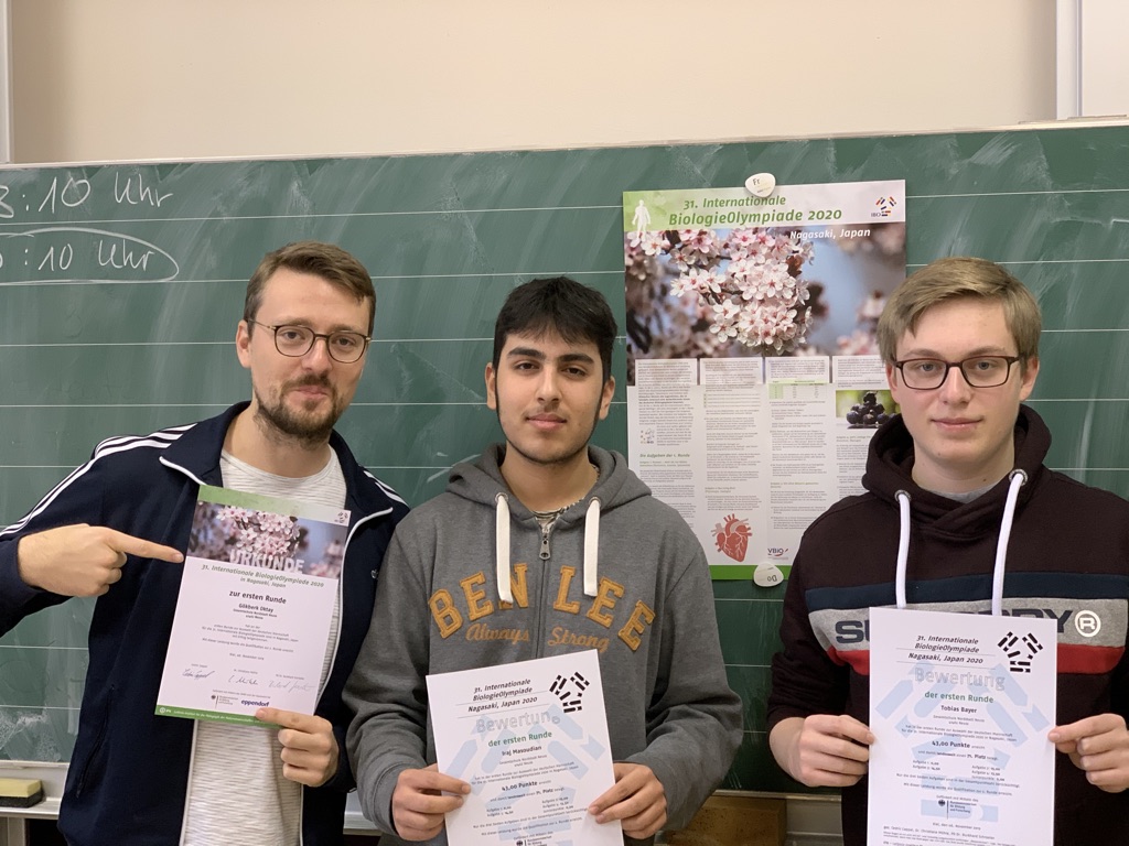Iraj Massoudian, Tobias Bayer und Gökberk Oktay lösten in der ersten Runde komplexe Aufgabenstellungen zu den Funktionen des Herzens, der Wirkweise der Waschnuss oder der Evolution der Pferde. Dabei setzten sie selbstständig Experimente an und lösten die Aufgaben freiwillig im Nachmittagsbereich. Betreut wurden die drei dabei von den Biologielehrern Dr. Dominik Spiegel und Lars Grummich.