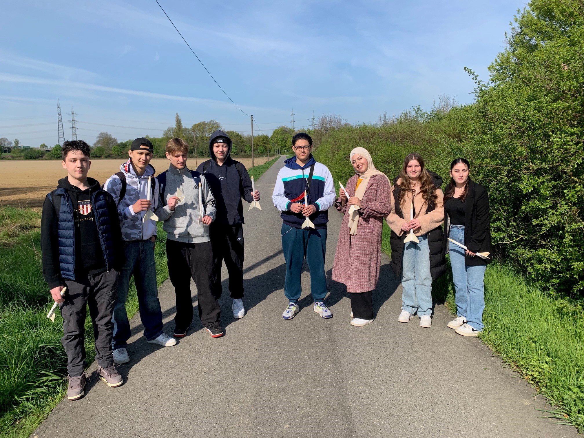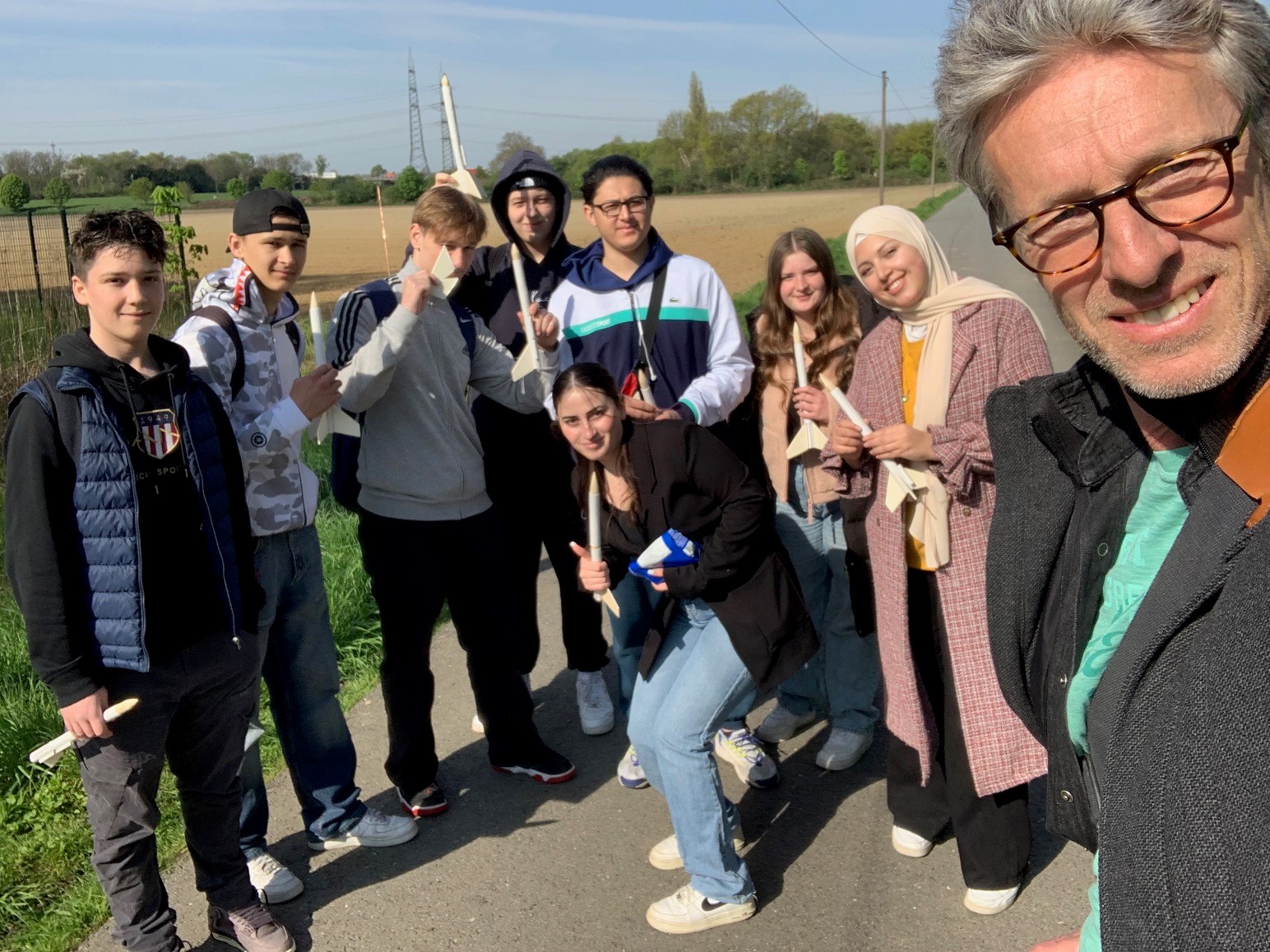 Im Rahmen der Unterrichtsreihe Luft und Raumfahrt haben die Schülerinnen und Schüler des Technikkurses in Klasse 10 zusammen mit ihrem Techniklehrer ihre selbstgebauten Modellraketen im freien Gelände gestartet. Die kleinen Raketen werden aus Holz und Papier hergestellt. Am höchsten Punkt der Flugbahn teilen sie sich und trudeln dann langsam zu Boden. Alle Raketenstarts waren erfolgreich und die Schülerinnen und Schüler hatten eine Menge Spaß bei der Aktion.