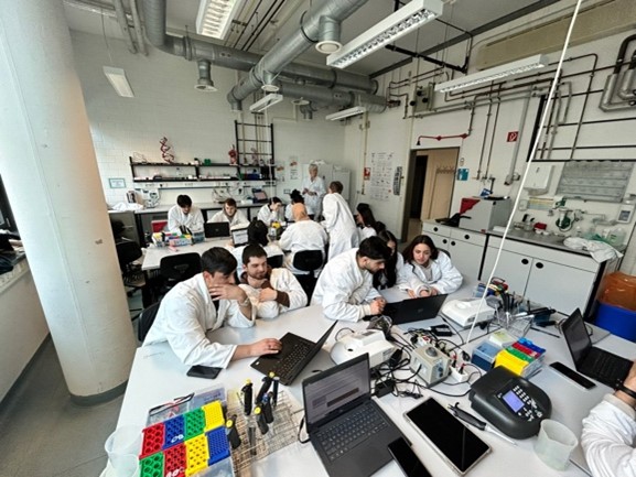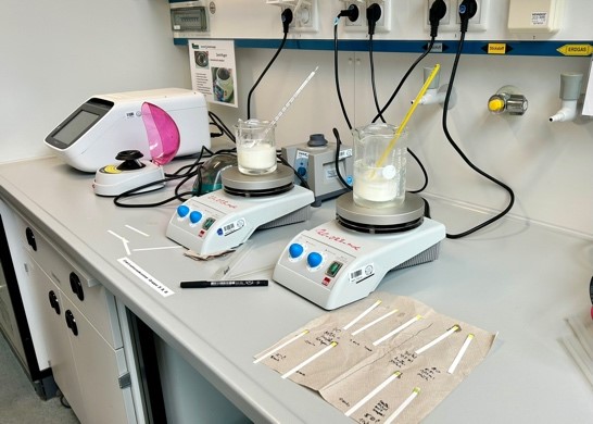 Am zweiten Praktikumstag starteten wir um 8 Uhr voller Vorfreude von der Jugendherberge aus zur Universität. Dort begann der spannendste Teil des Praktikums: im Kontext des Themas Enzyme führten wir in Gruppen verschiedene Experimente durch und nutzten dabei verschiedene Geräte, die für uns vorher unbekannt waren. Beispielsweise pipettierten wir und nutzten Zentrifugen. Auch am dritten und letzten Tag des Praktikums ging es um das Thema Enzyme und wir untersuchten die Wirkung des Enzyms Lactase unter verschiedenen Bedingungen und in verschiedenen Milchprodukten. Dabei mussten wir die Experimente dieses Mal selbstständig entwickeln und hatten keine vorgegebene Versuchsanleitung. Es war interessant zu sehen, wie sich die Enzymaktivität je nach Produkt und Bedingungen unterschied! Am Ende des Tages stellten wir unsere Ergebnisse in Form von kurzen Präsentationen vor und konnten noch einiges voneinander lernen.
