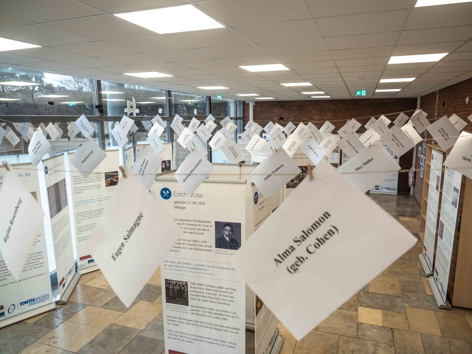 Neben informativen Stationen sind in der Ausstellung didaktisch aufbereitete Arbeitsmaterialien und interaktive Mitmachstationen verfügbar. Besonders eindringlich sind die Videobeiträge der KZ-Überlebenden Esther Bejarano sowie die Namen aller Opfer aus Neuss, die an der Decke der Bibliothek als Würdigung zu finden sind.