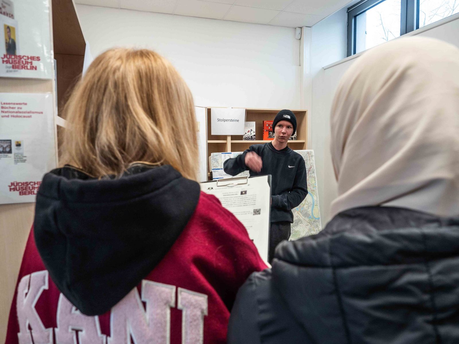 Er betonte, welchen besonderen Stellenwert solche Ausstellungen, besonders im Kontext Schule, haben. Er sprach dabei direkt die anwesenden Schülerinnen und Schüler an und dankte ihnen für ihr Engagement gegen Rassismus und Antisemitismus. Er unterstrich dabei, wie wichtig dieses Auftreten gerade nach dem 7.Oktober und dem Terror der Hamas für jüdische Mitmenschen in Deutschland ist. (…).