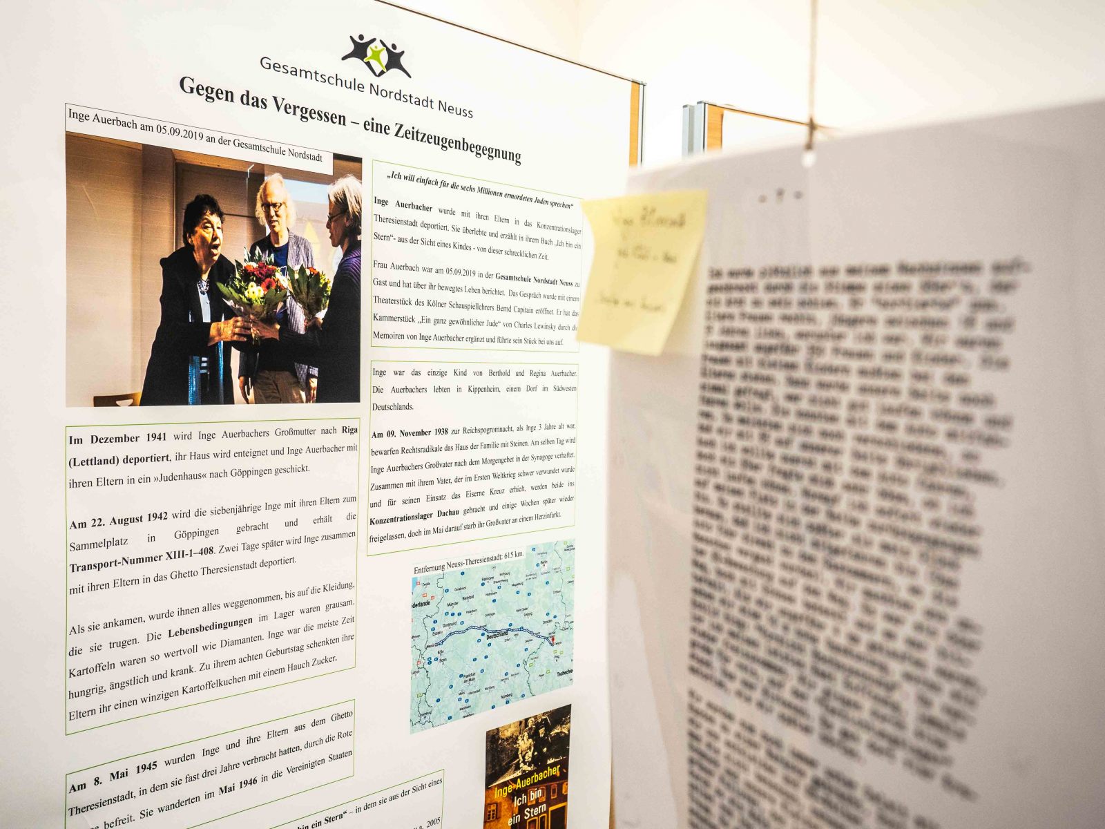 Zudem wird in einem eigens von den Schülerinnen und Schülern gestalteten „Neusser Raum“ ein Einblick in die jüdische Geschichte von Neuss gewährt. In Zusammenarbeit mit dem Stadtarchiv sind u.a. Zeitungsartikel aus Neuss in Anschluss an die Reichspogromnacht und Berichte von Zeitzeugen, die bereits in der Schule zu Besuch waren, ausgestellt.