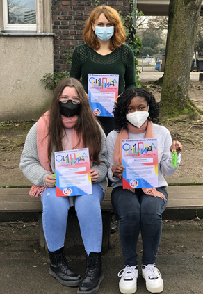 Joana Linnartz (l.) und Memuna Tarawally (r) aus dem Russischkurs im 9. Jahrgang von Irina Sporn (hinten) haben einen gelungenen Filmbeitrag auf Russisch erstellt und beim Kreativwettbewerb der Olympiade eingereicht. Aus dem 8. Jahrgang hat Ivan Ertel am Sprachwettbewerb teilgenommen. Alle Teilnehmerinnen und Teilnehmer, ebenso wie die Kursleiterin, haben nun ihre Urkunden als Dank für ihr Engagement erhalten.